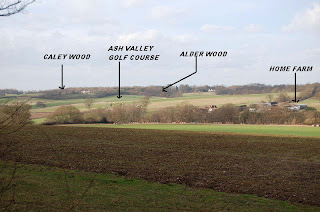 The labelled photo was taken from the corner of the golf course looking north east. The morning frost still visible on the northern side of the hedgerow.